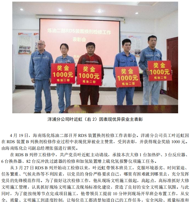 優(yōu)秀!洋浦分公司葉近虹獲業(yè)主表彰