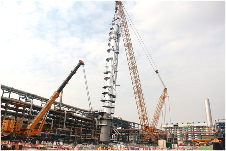 1月16日,總重189噸、高55米減壓分餾塔(C501)整體一次吊裝成功